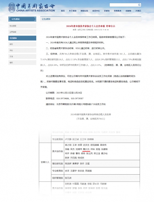 2024年度中国美术家协会个人会员申报终审工作已结束。现将申报审核情况公示如下: